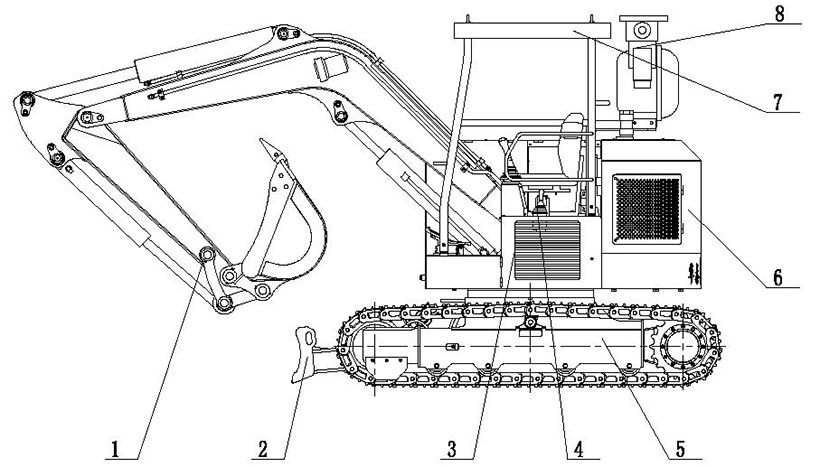 La plataforma giratoria del excavador de orugas compacto presenta una estructura que ofrece una alta rigidez. La parte inferior de la plataforma está conectada con la placa base mediante un cojinete giratorio. En el medio, hay un brazo robotizado y un reductor de giro, que junto con el cojinete giratorio componen un sistema giratorio. En la parte derecha de la plataforma giratoria, están instalados un tanque de aceite hidráulico y una válvula principal. En la parte izquierda está la cabina de operación, equipada con un asiento cómodo, un techo protector y válvulas piloto.