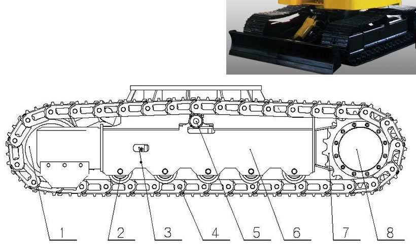 Todo el sistema de desplazamiento consiste en orugas, placa base, dispositivo de desplazamiento y dispositivo de estiramiento de orugas. Es por eso que el excavador muestra una buena capacidad para escalar pendientes y curvas cerradas, así como también presenta una baja presión al suelo y desplazamiento estable. Las dos orugas instaladas son accionadas independientemente por dos dispositivos de accionamiento, permitiendo un desplazamiento, rotación y más.