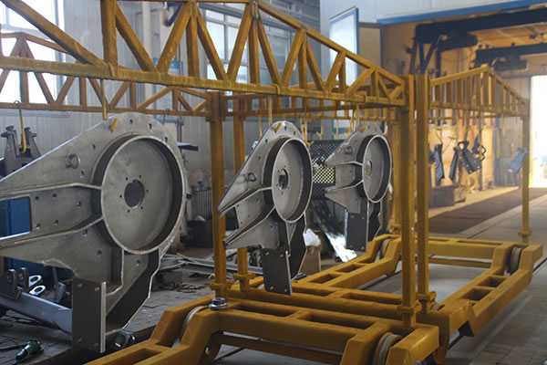 Piezas de trabajo siendo pintadas y sometidas a tratamiento de arenado.